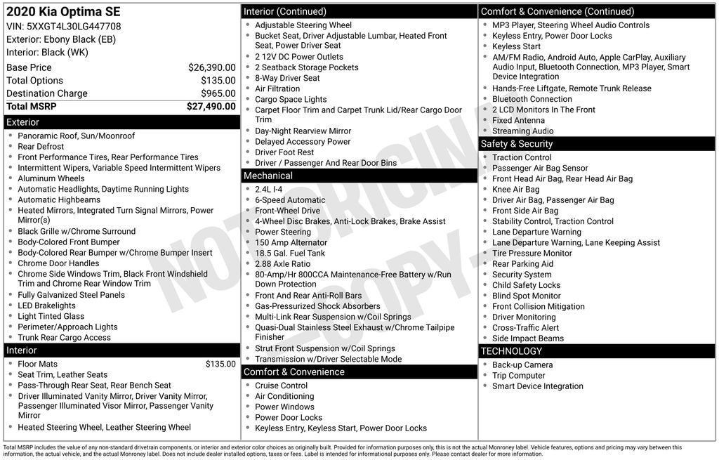 Ebony Black 2020 Kia Optima SE FWD 6-Speed Automatic with Sportmatic 2.4L I4 DGI DOHC 24/32 City/Highway MPG