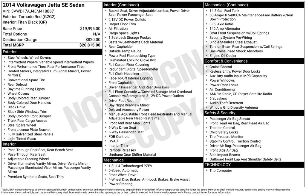 Red 2014 Volkswagen Jetta 1.8T SE FWD 6-Speed Automatic 1.8L I4 DOHC 25/36 City/Highway MPG